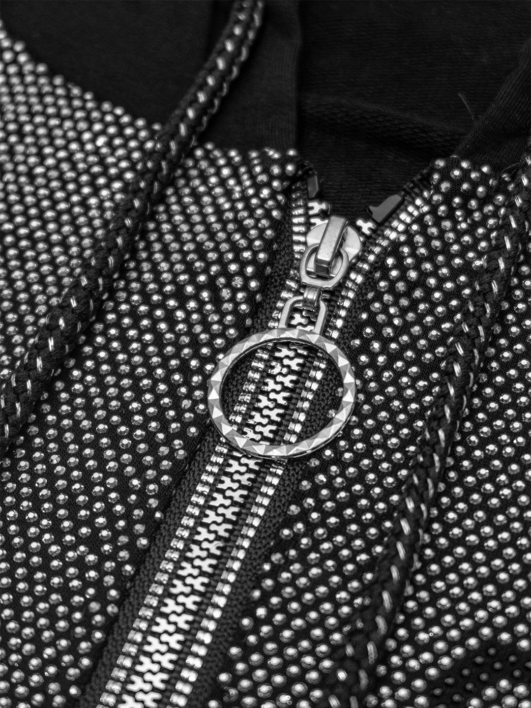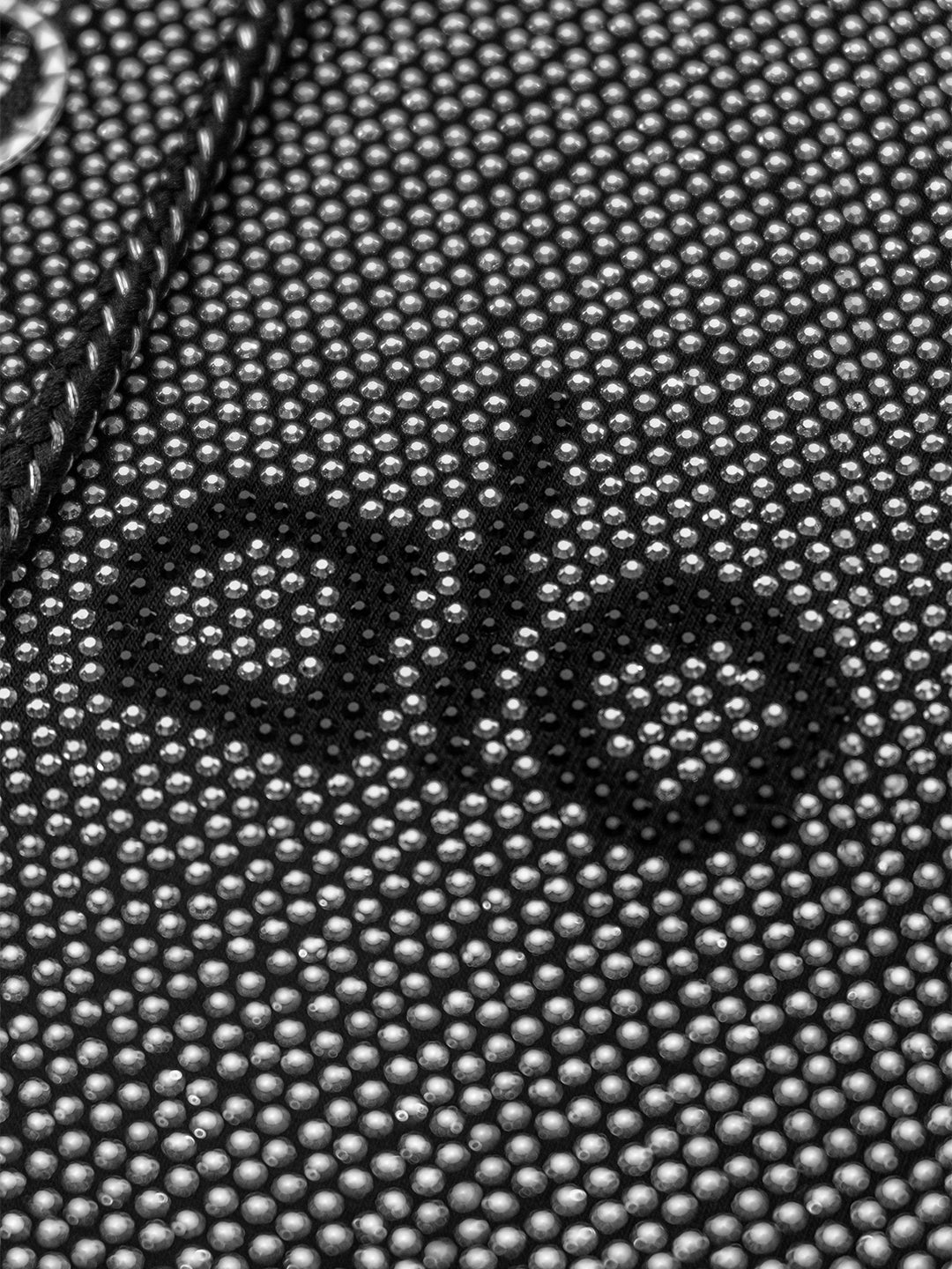 تباين جذاب: تبرز أحجار الـ (ستراس كريستال حراري) الفضية بوضوح مذهل على خلفية القماش الأسود الداكن، لتعطيكِ إطلالة نظيفة وراقية.