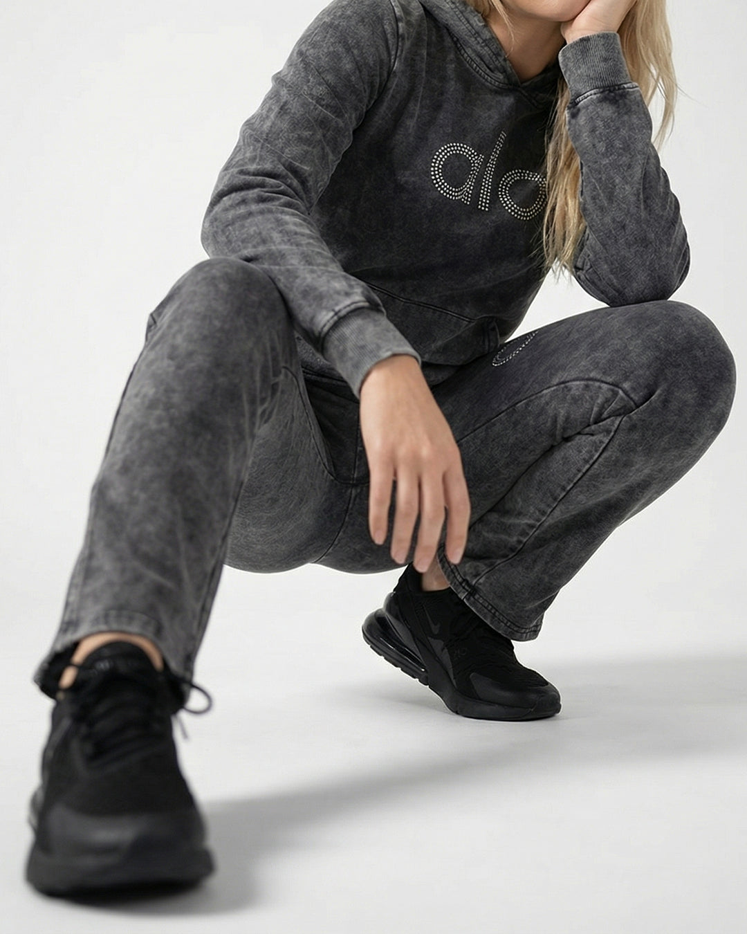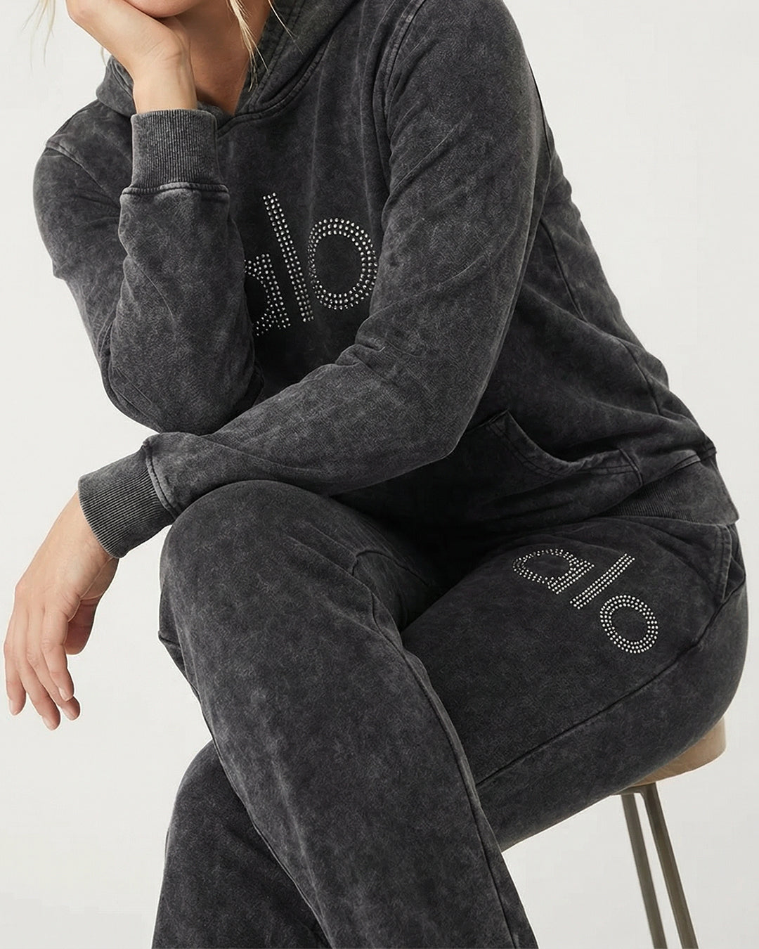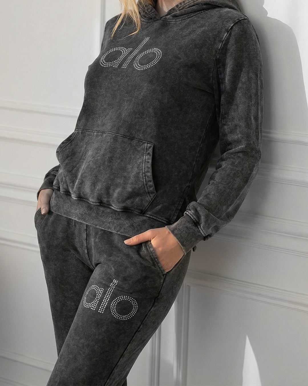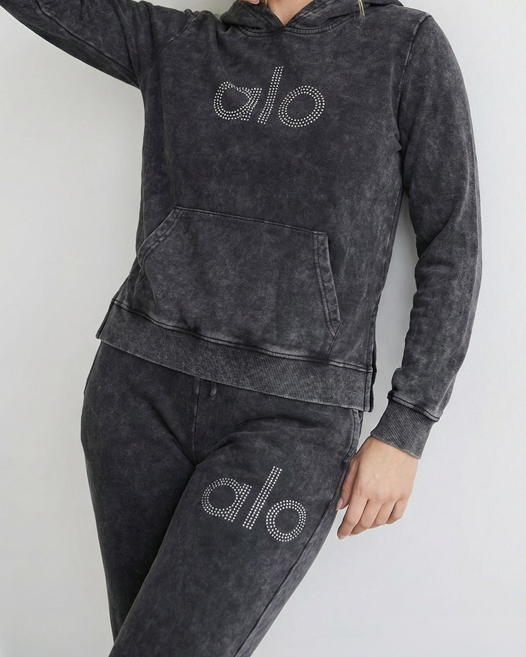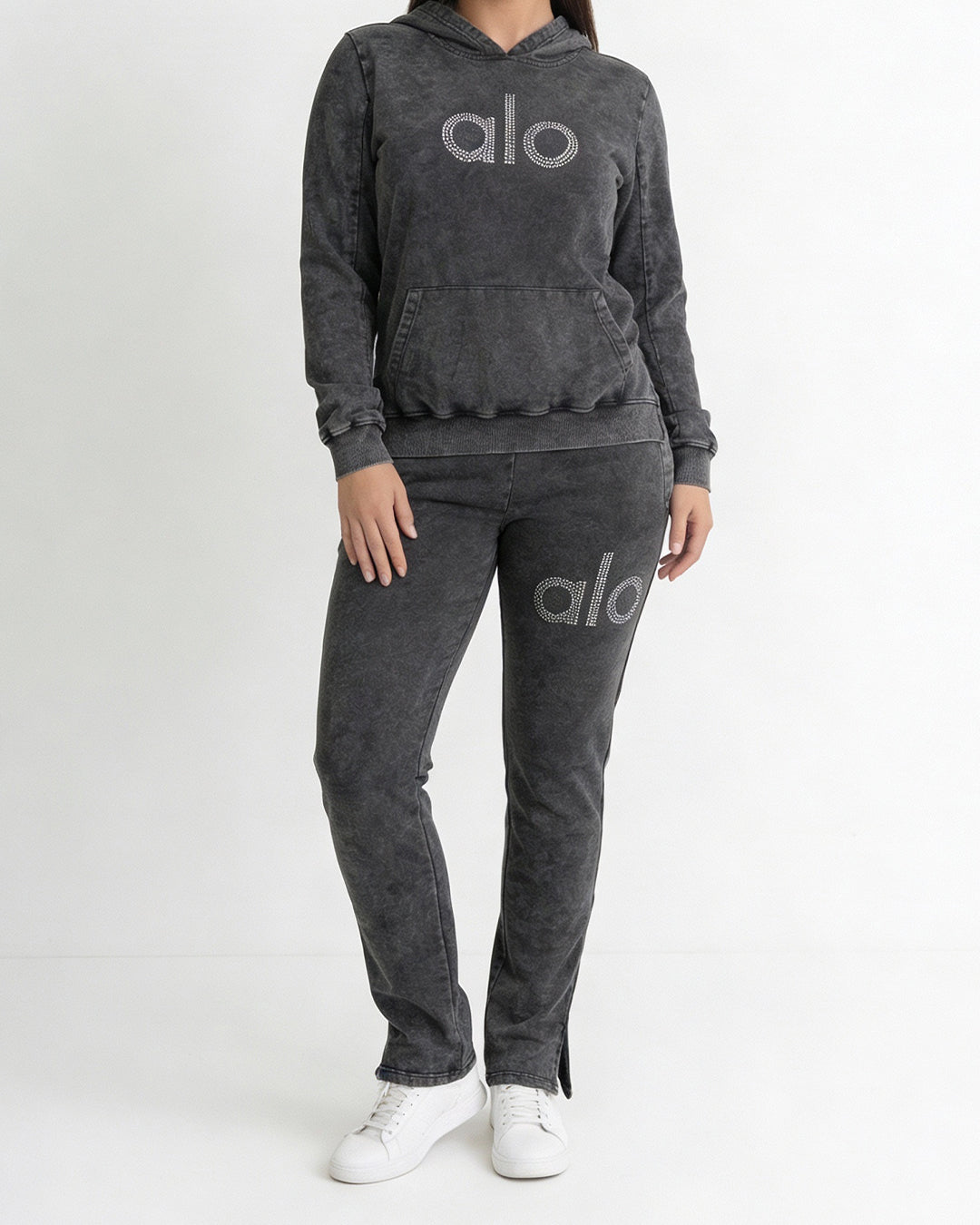 • لمسة بريق: مزين بشعار "alo" بأحجار الكريستال البراقة على الصدر والساق، مثبتة لتدوم ولا تتساقط أبداً.