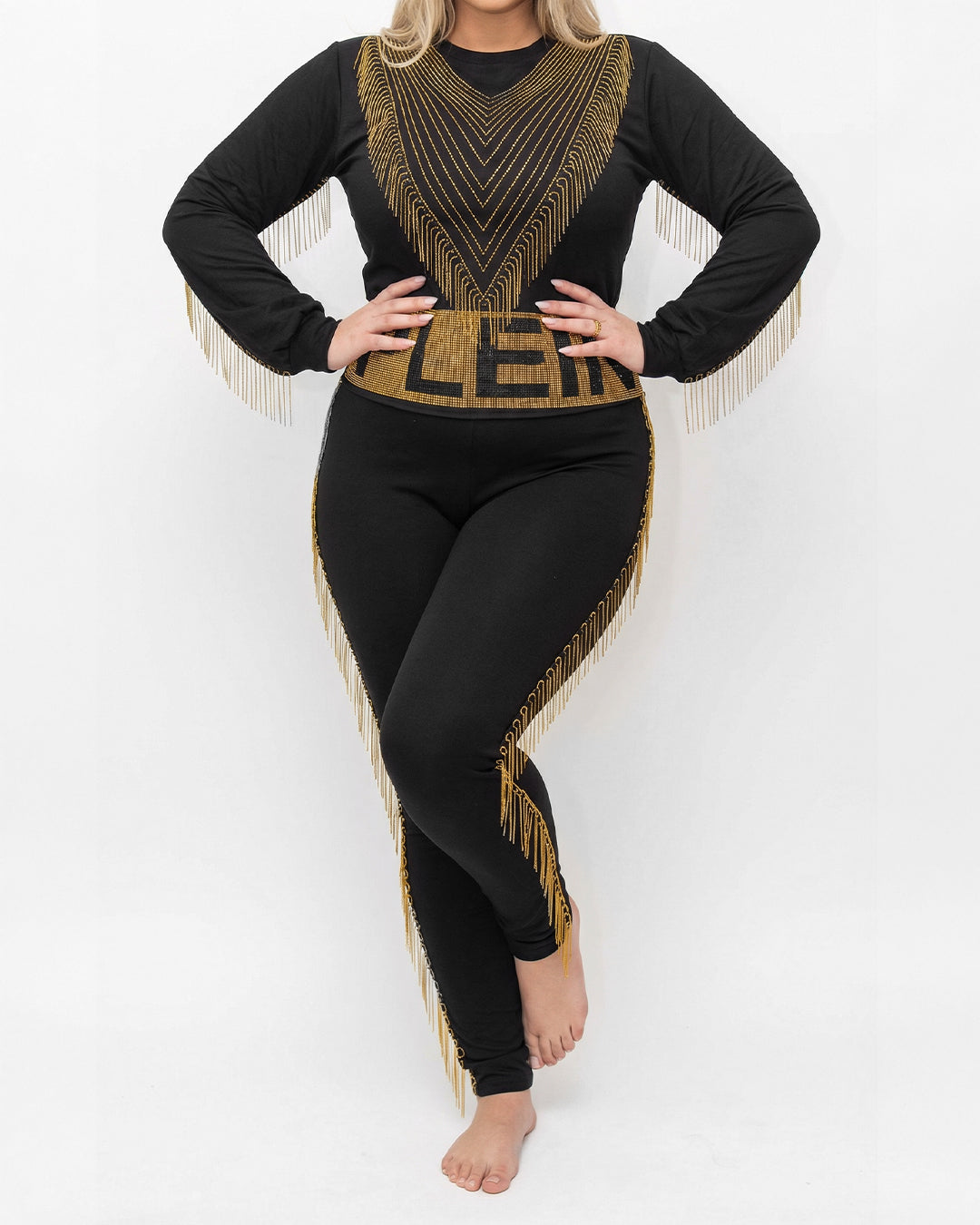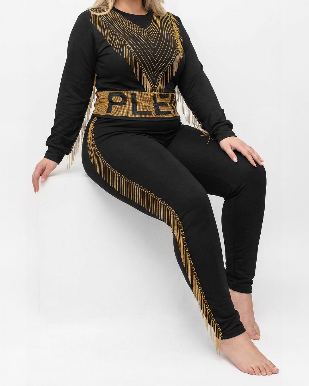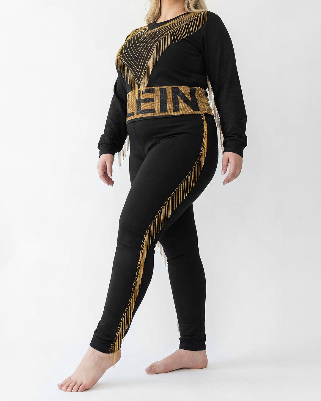 حركة وانسيابية: يتميز الطقم بسلاسل ذهبية ناعمة مثبتة بدقة على الأكمام والصدر وجوانب البنطلون، تتحرك معكِ وتمنحكِ مظهراً حيوياً وجذاباً.