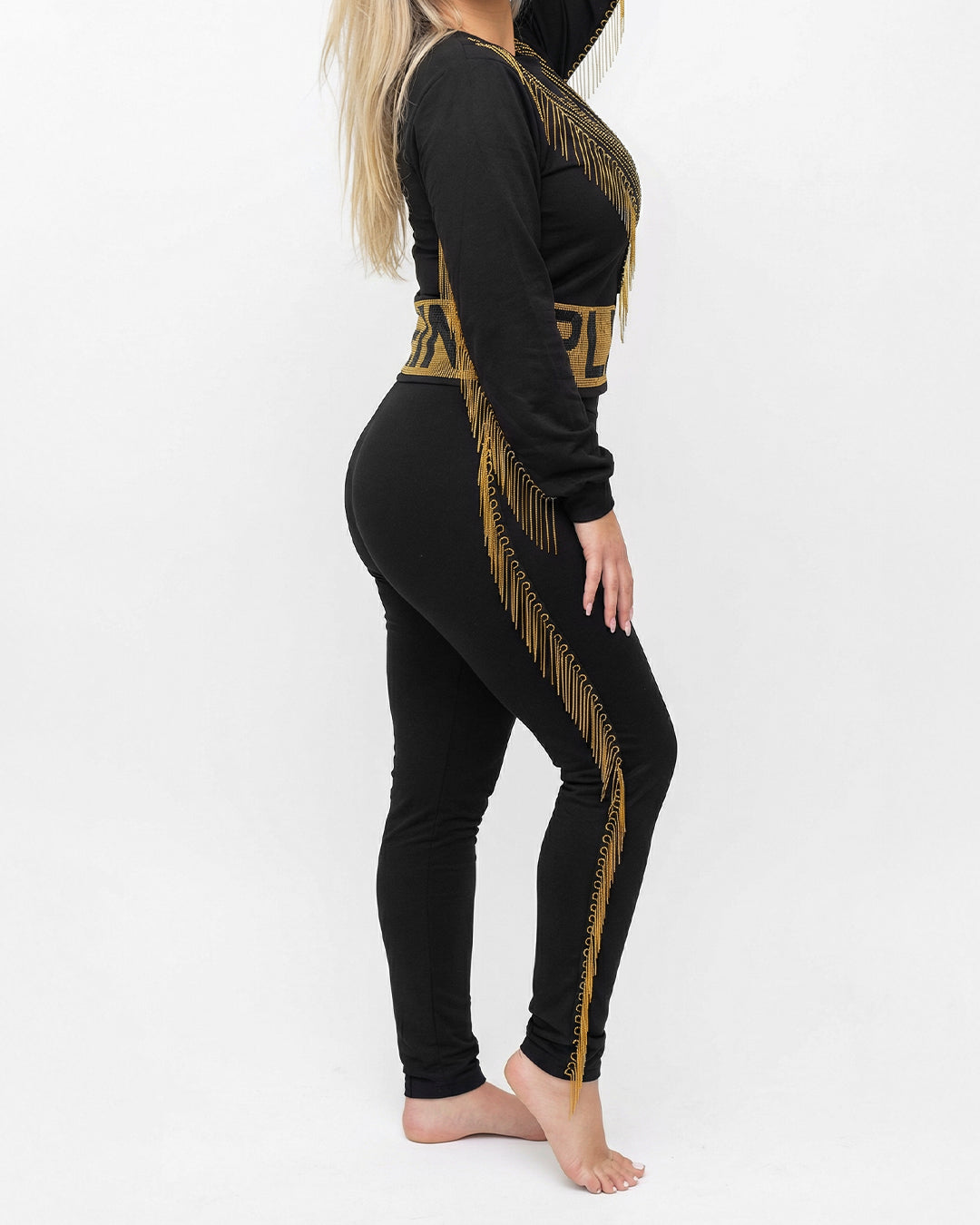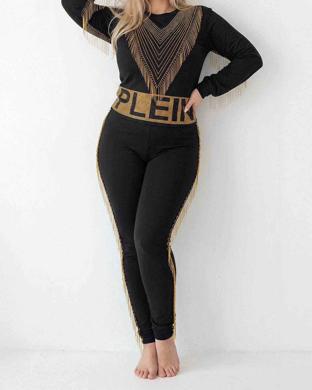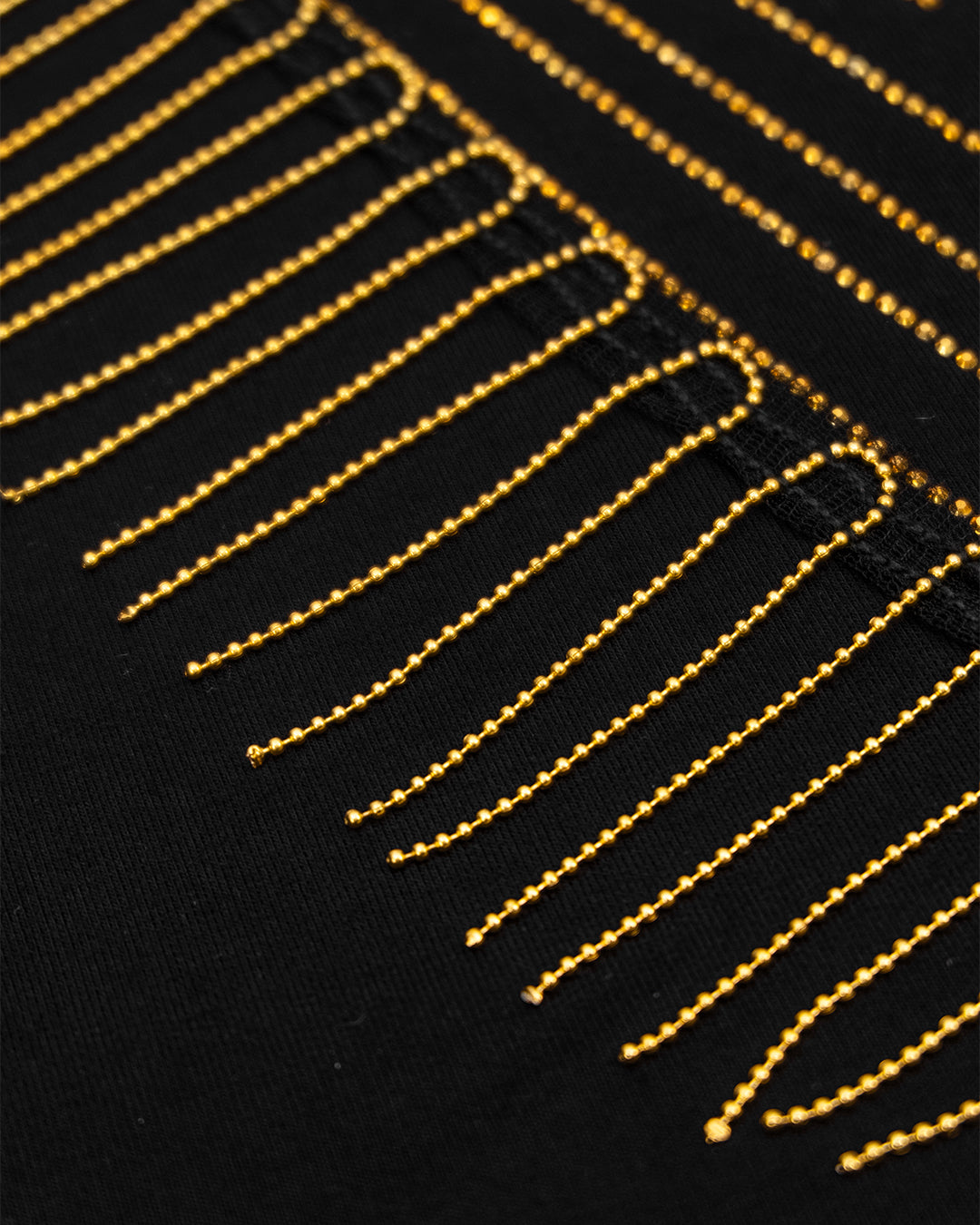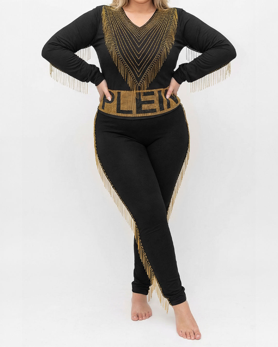 حركة وانسيابية: يتميز الطقم بسلاسل ذهبية ناعمة مثبتة بدقة على الأكمام والصدر وجوانب البنطلون، تتحرك معكِ وتمنحكِ مظهراً حيوياً وجذاباً.