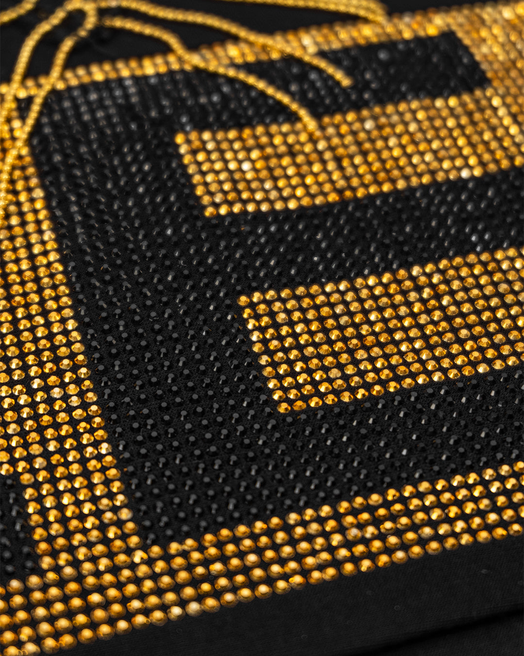 تصميم الـ V-Neck: ياقة على شكل حرف V مزينة بشرائط من الستراس الذهبي تمنح الرقبة طولاً وأناقة.