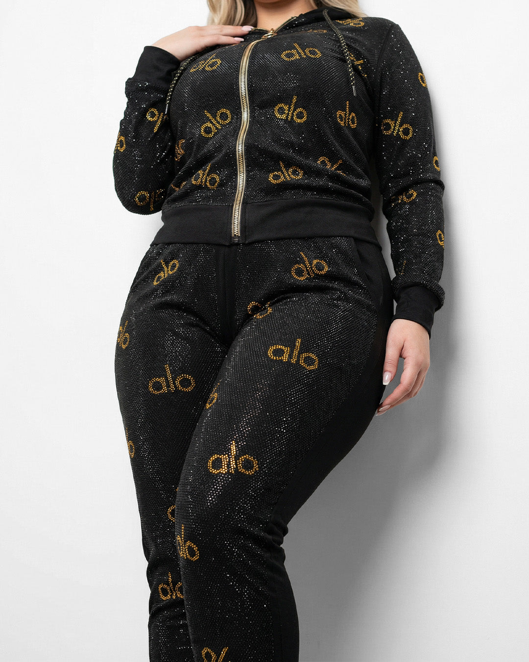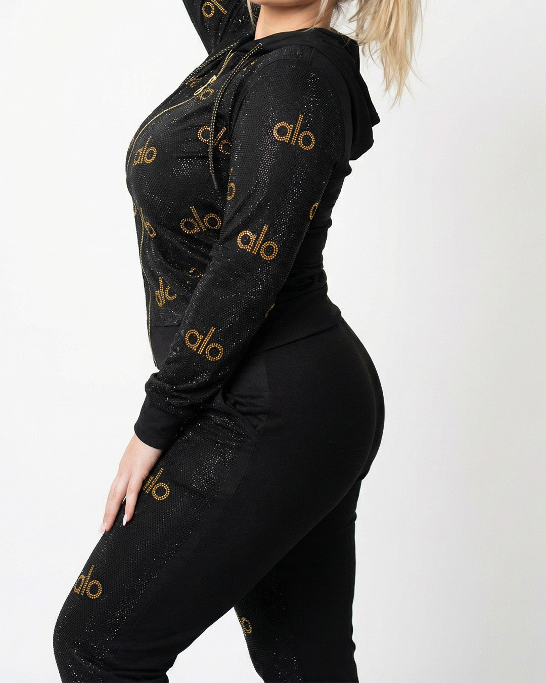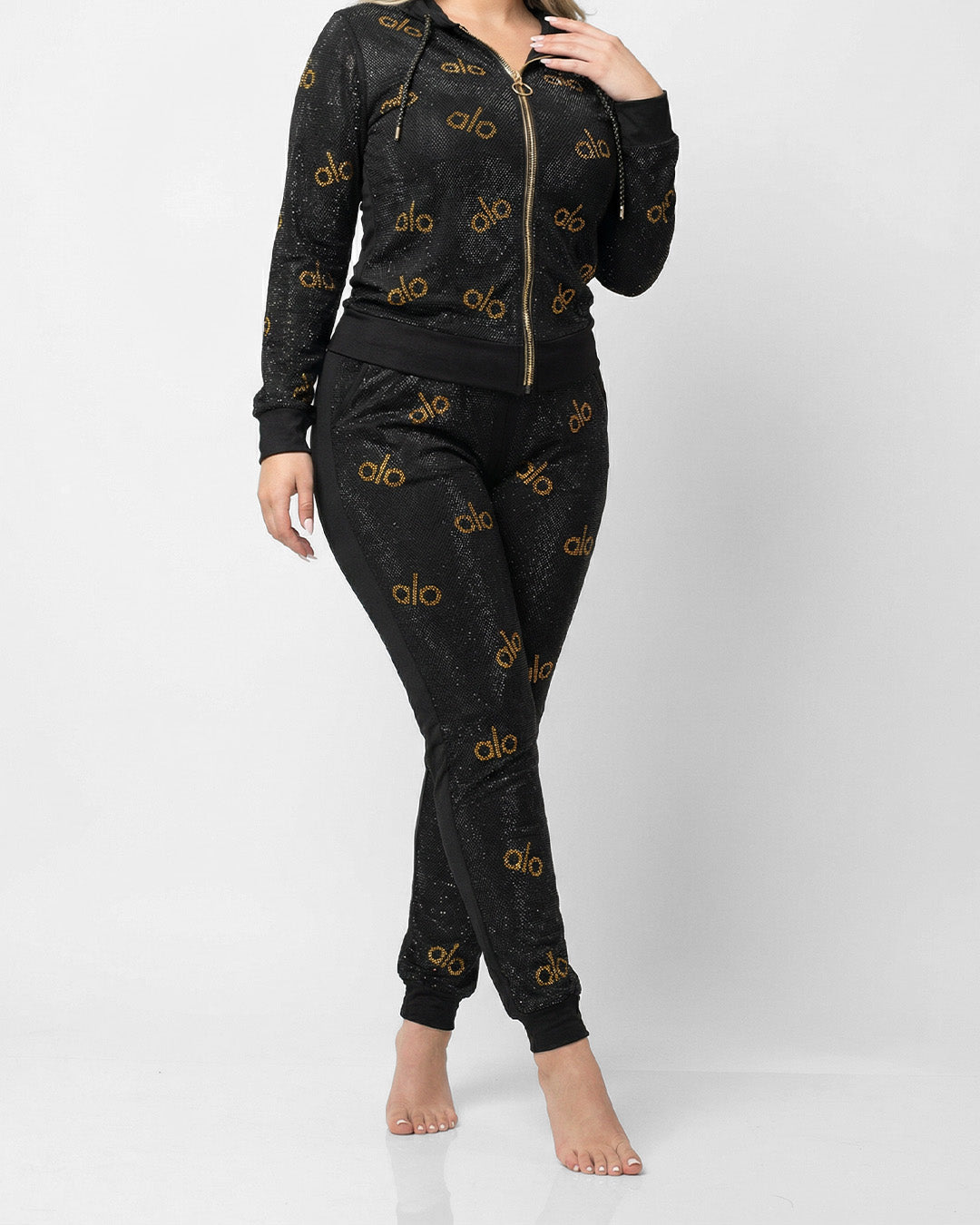 صيحة المونوغرام: يتميز القماش بانتشار كلمة "alo" المكتوبة بـ (ستراس كريستال حراري) ذهبي على كامل الجاكيت والبنطلون، مما يمنحك مظهراً حيوياً وشبابياً.