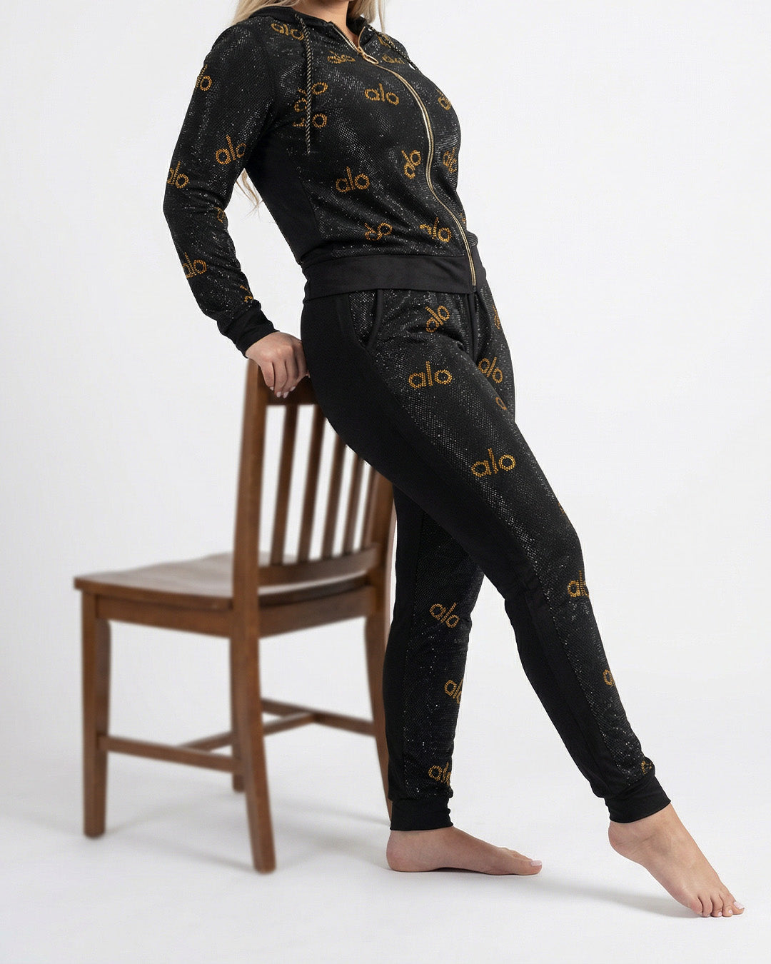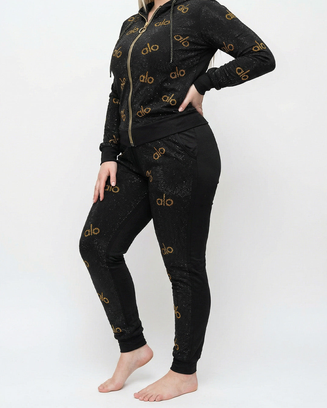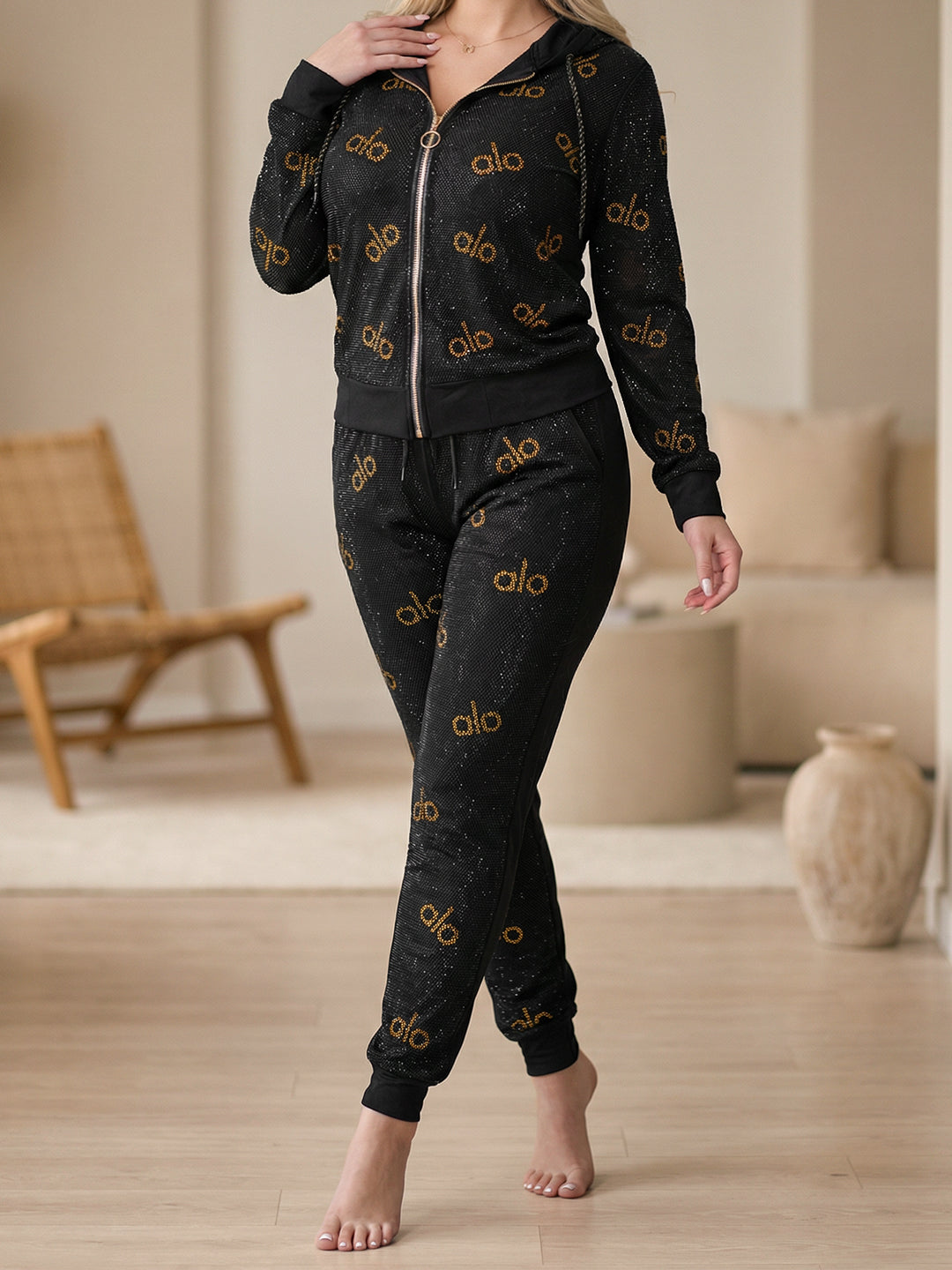 صيحة المونوغرام: يتميز القماش بانتشار كلمة "alo" المكتوبة بـ (ستراس كريستال حراري) ذهبي على كامل الجاكيت والبنطلون، مما يمنحك مظهراً حيوياً وشبابياً.
