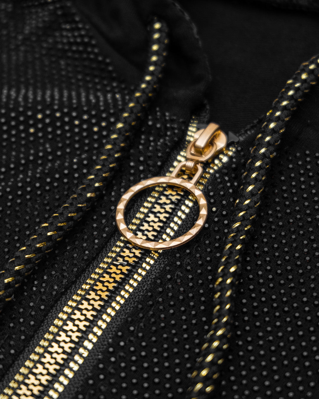 تفاصيل عملية: جاكيت بسحاب (سستة) ذهبي بحلقة دائرية أنيقة، وجيوب جانبية مريحة، مع قبعة (هودي) تضفي لمسة دافئة.